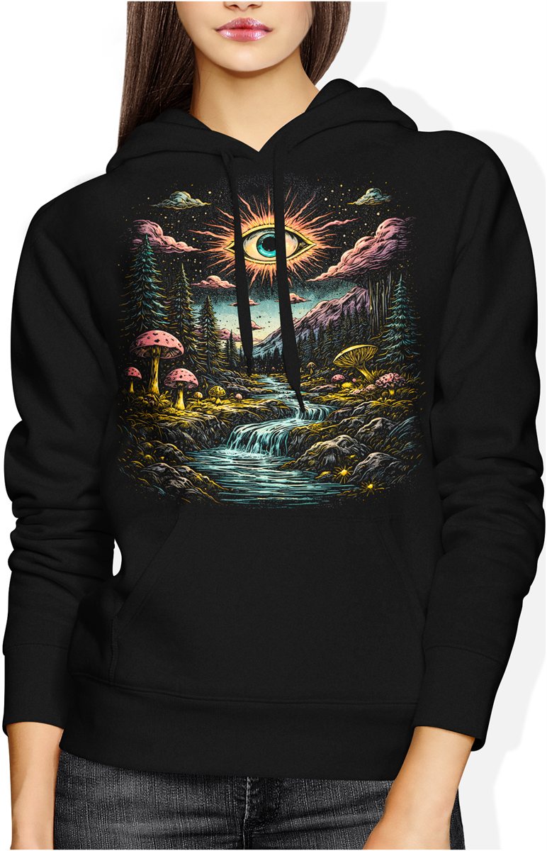 Mistyczne oko krajobraz góry las wodospad grzyby surrealizm psychodela natura fantasy Damska bluza z kapturem