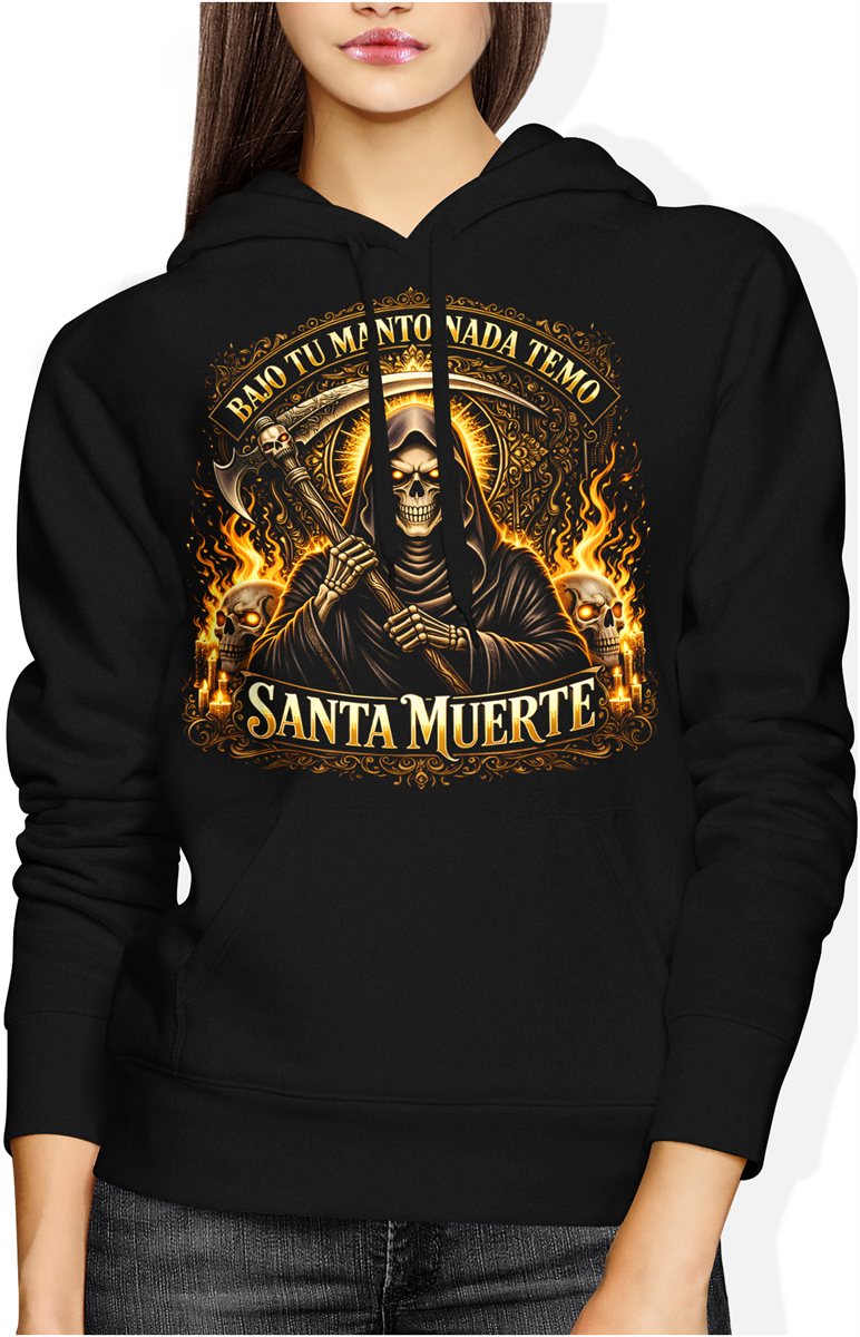 Santa Muerte złota postać śmierci kosa płomienie czaszki religijny mroczny motyw styl tattoo Damska bluza z kapturem