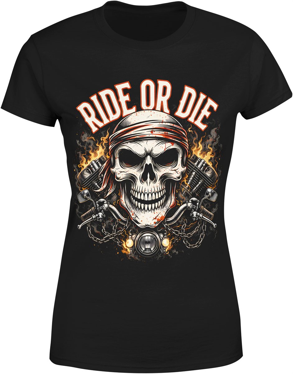 Czaszka biker motocykl ride or die ogień łańcuchy adrenalina wolność droga styl moto Damska koszulka