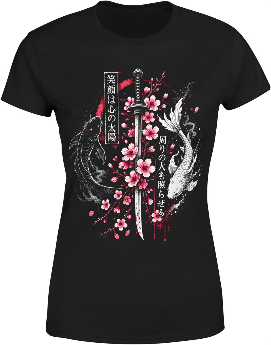 Karp koi yin yang katana sakura styl japoński zen samuraj ryba koi orientalny motyw Japonia Damska koszulka