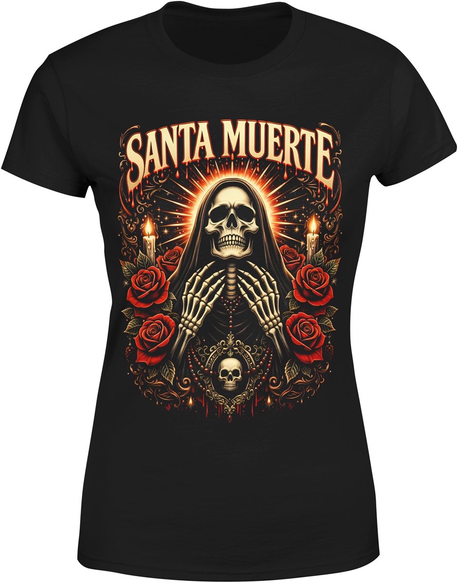 Santa Muerte czaszka róże świece mistyczny klimat religijny symbol śmierci tattoo dark styl Damska koszulka