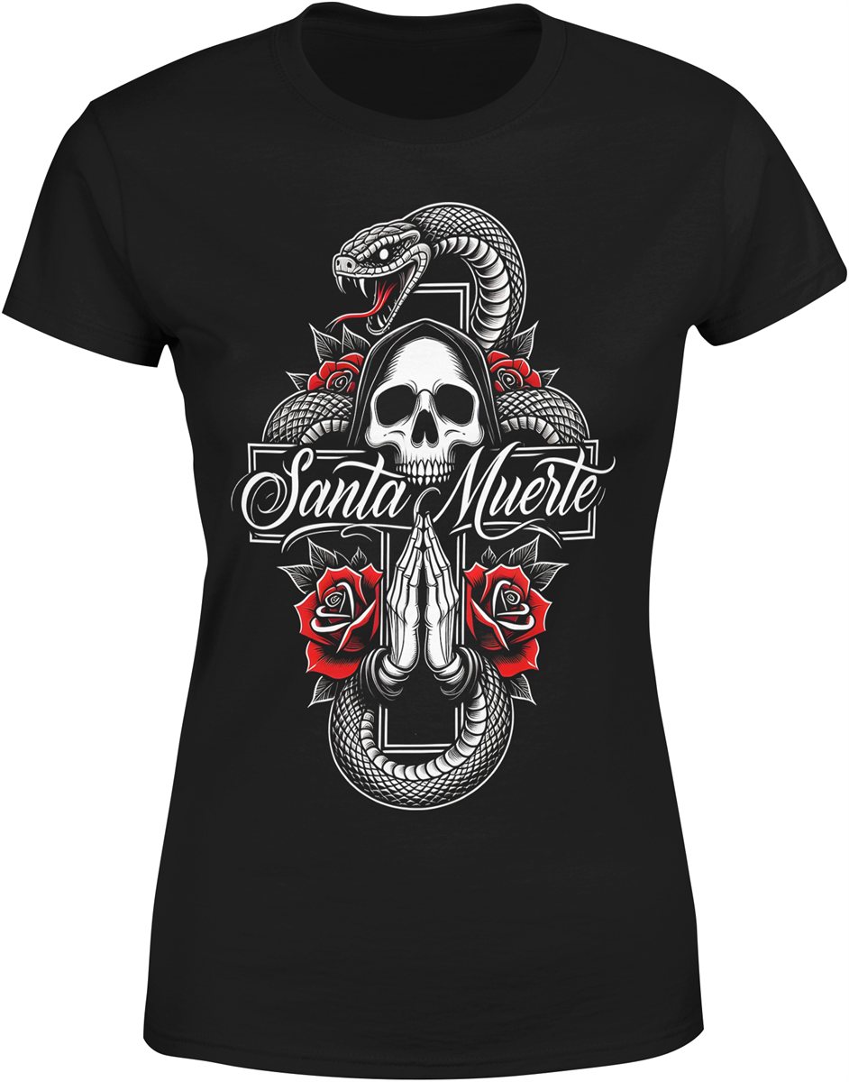 Santa Muerte czaszka róże wąż symbolika mistyczna mroczny klimat tatuaż styl Damska koszulka