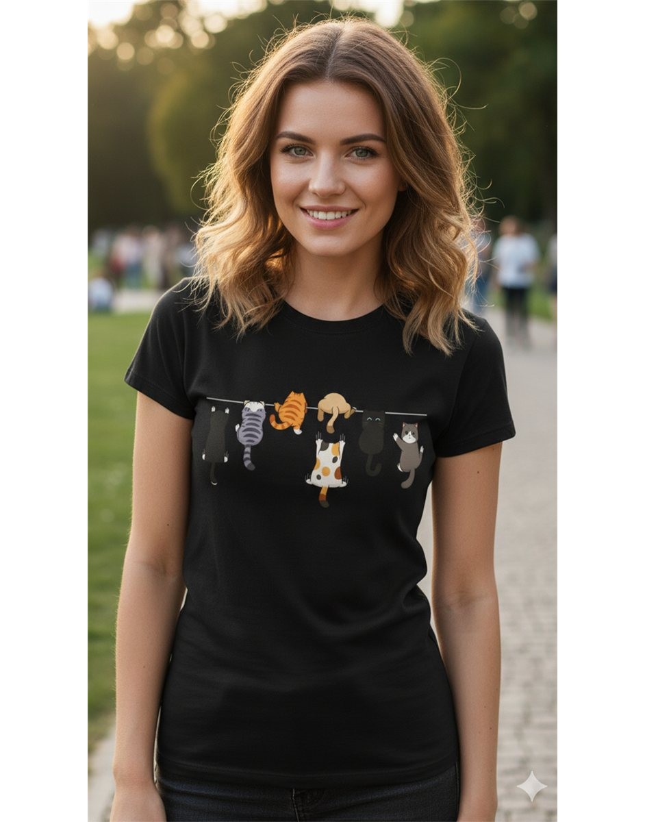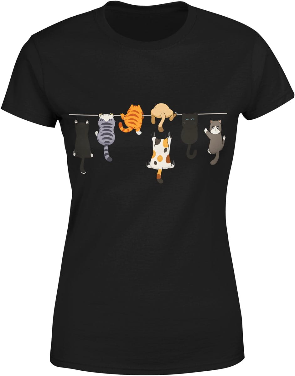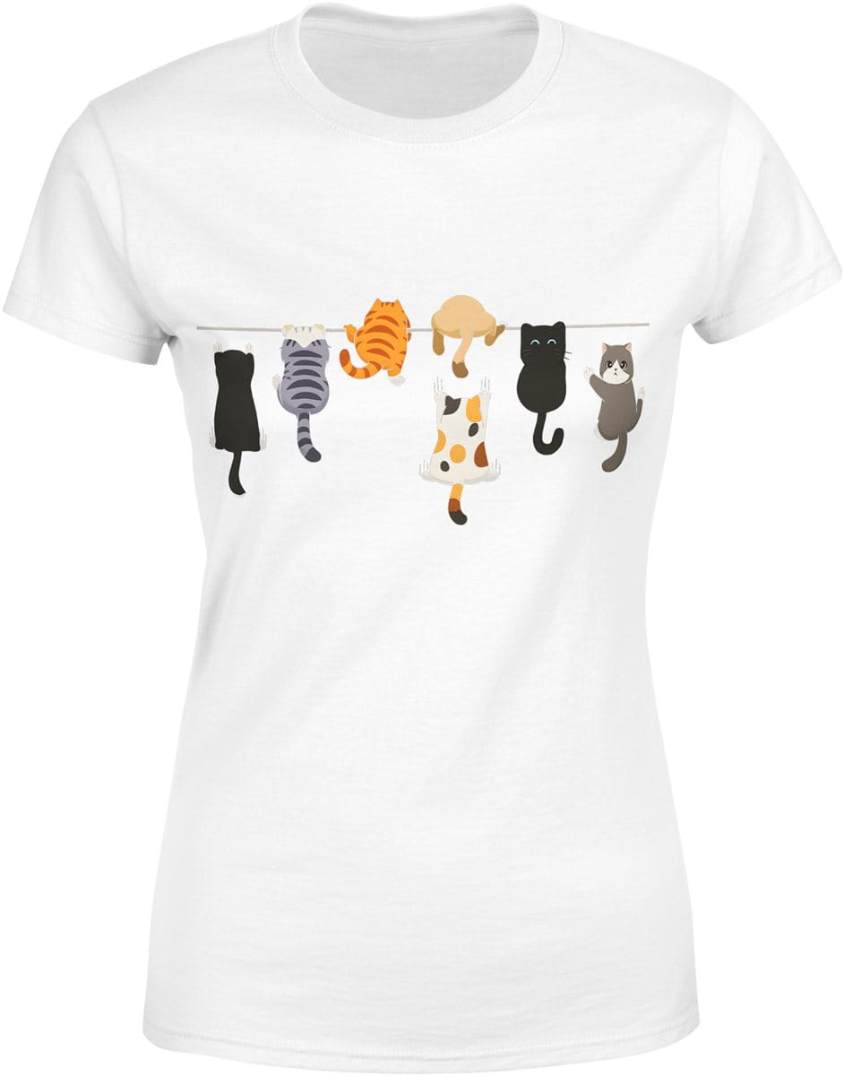 Słodkie koty wiszące na sznurku koci humor Damska koszulka