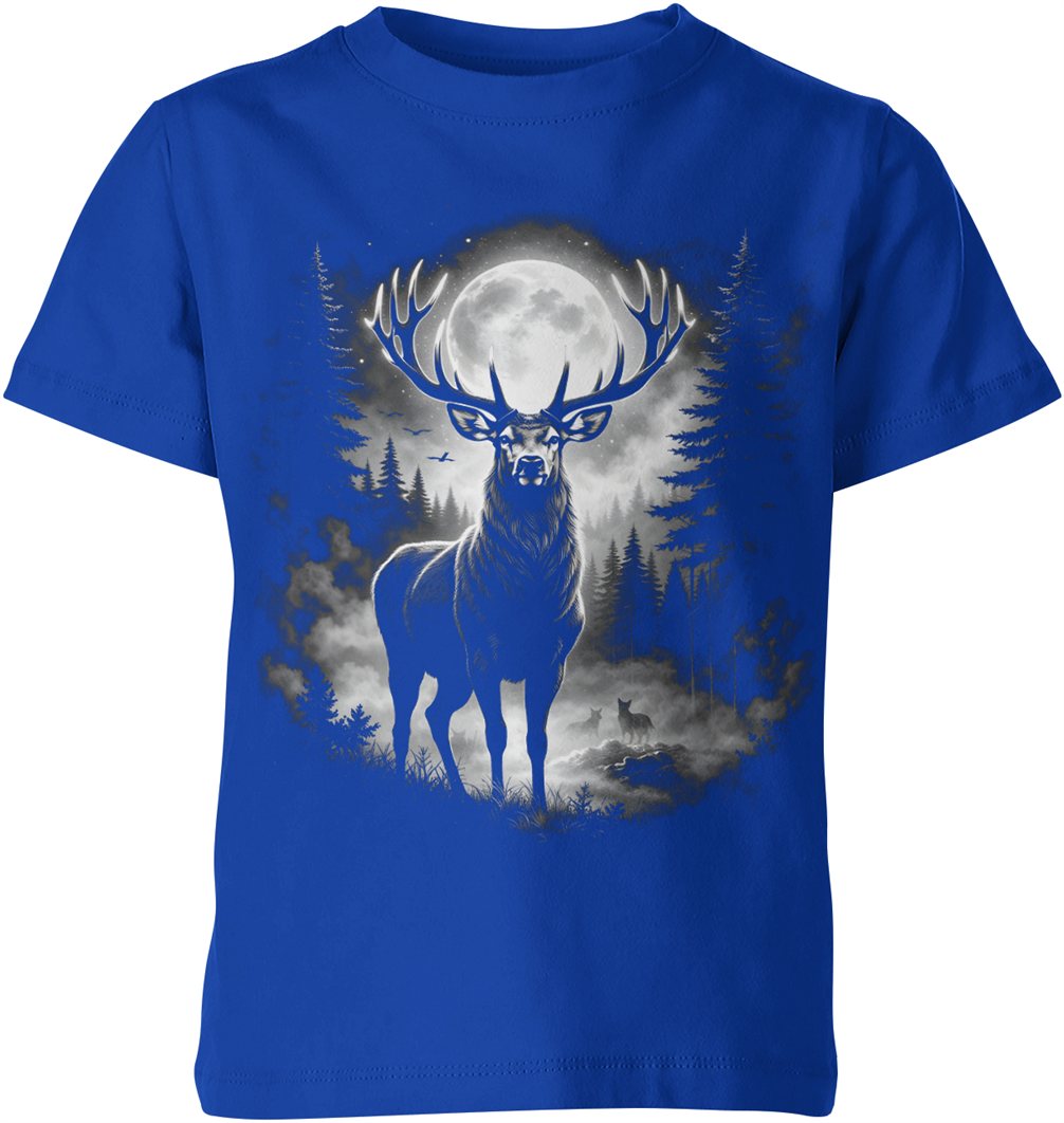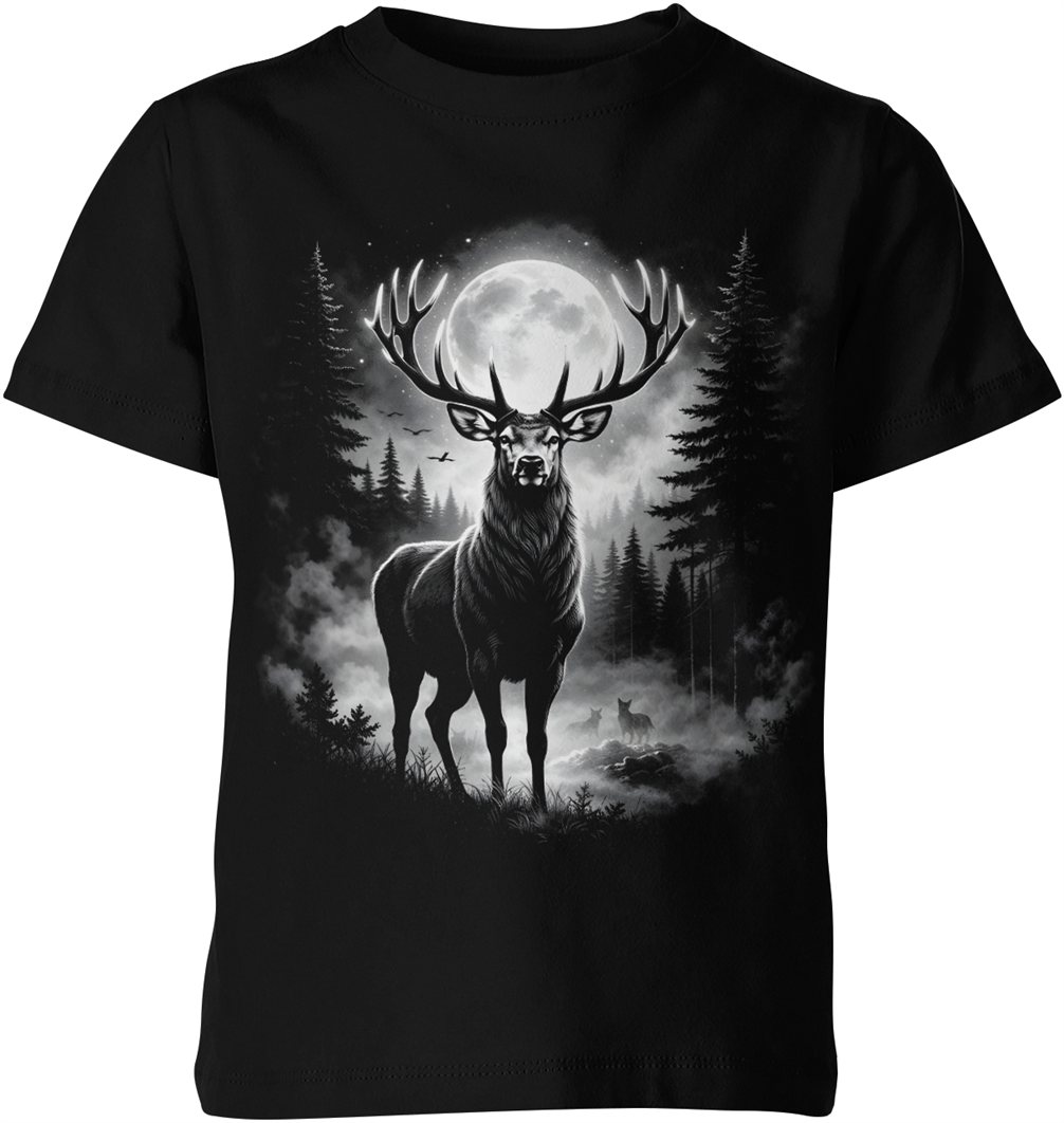 Jeleń w lesie noc księżyc natura dzikie zwierzę mgła klimat wilderness spokojny styl Dziecięca koszulka