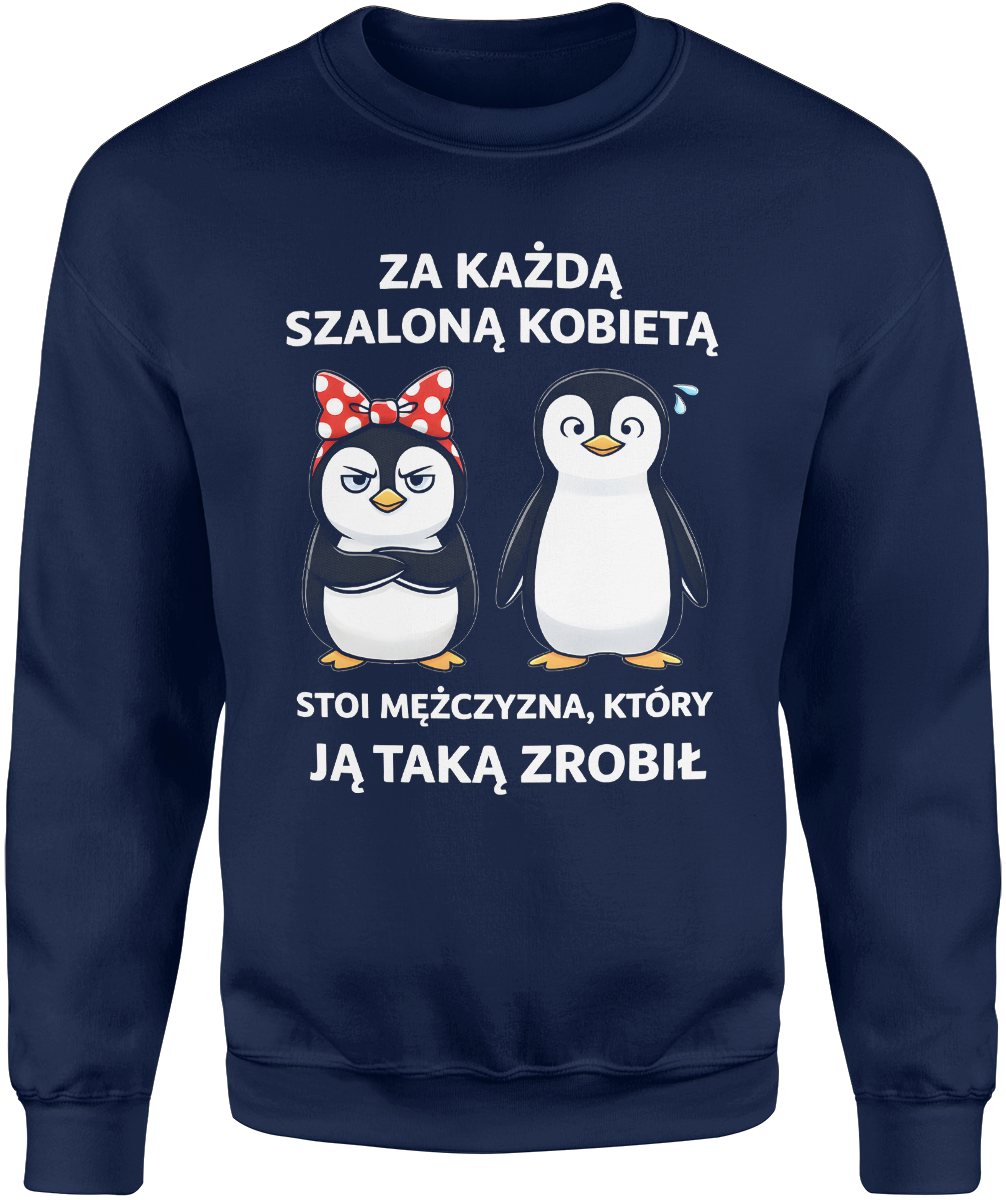 Pingwiny para kobieta z kokardą i facet tekst za każdą szaloną kobietą humor relacja związek Męska bluza