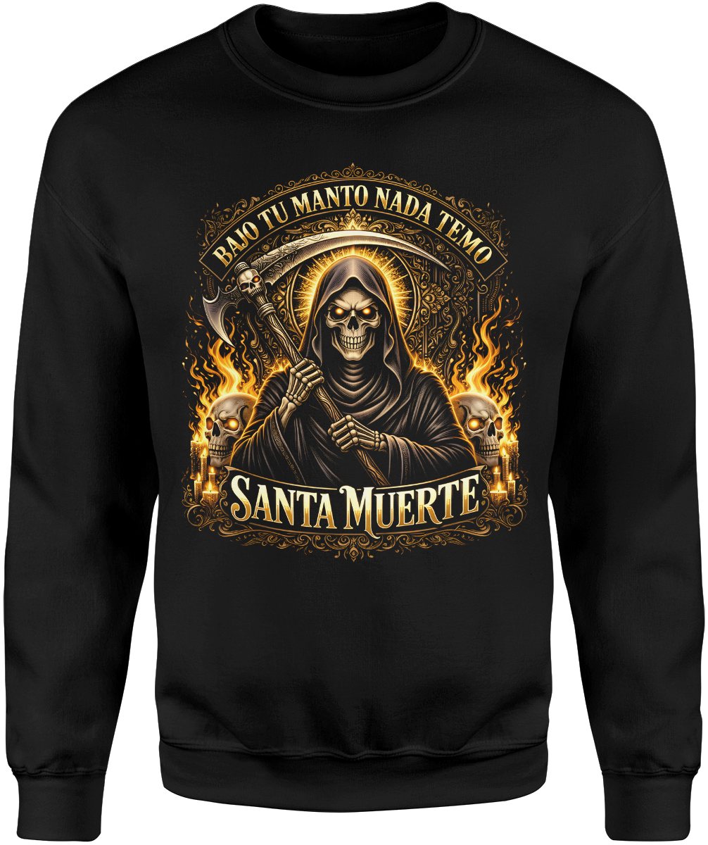 Santa Muerte złota postać śmierci kosa płomienie czaszki religijny mroczny motyw styl tattoo Męska bluza