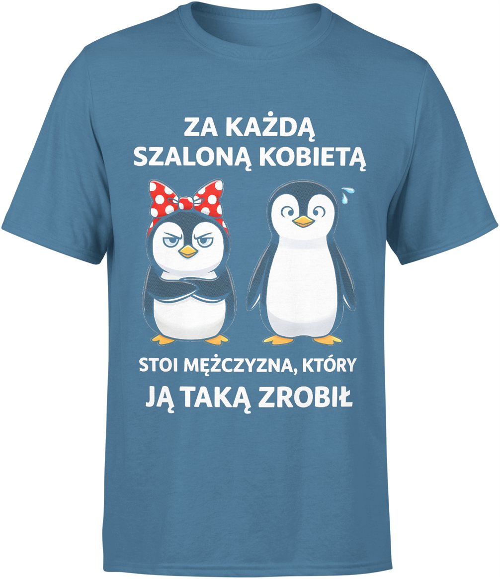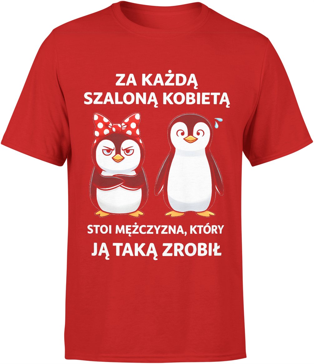 Pingwiny para kobieta z kokardą i facet tekst za każdą szaloną kobietą humor relacja związek Męska koszulka